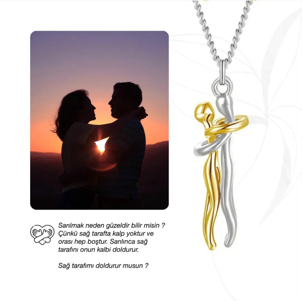 ✨ Ürün Özellikleri: ✔ Malzeme: Paslanmaz çelik ✔ Zincir Uzunluğu: 45 cm ✔ Renk: Altın & Gümüş kombinasyonu ✔ Özel Tasarım: Sevgiyi ve bağlılığı simgeleyen çift figürü ✔ Hediye Seçeneği: Sevgiliniz, eşiniz veya özel birini mutlu etmek için ideal Romantik bir hediye arıyorsanız veya kendiniz için zarif bir aksesuar istiyorsanız, bu kolye tam size göre! Stoklarla sınırlı, kaçırmayın!