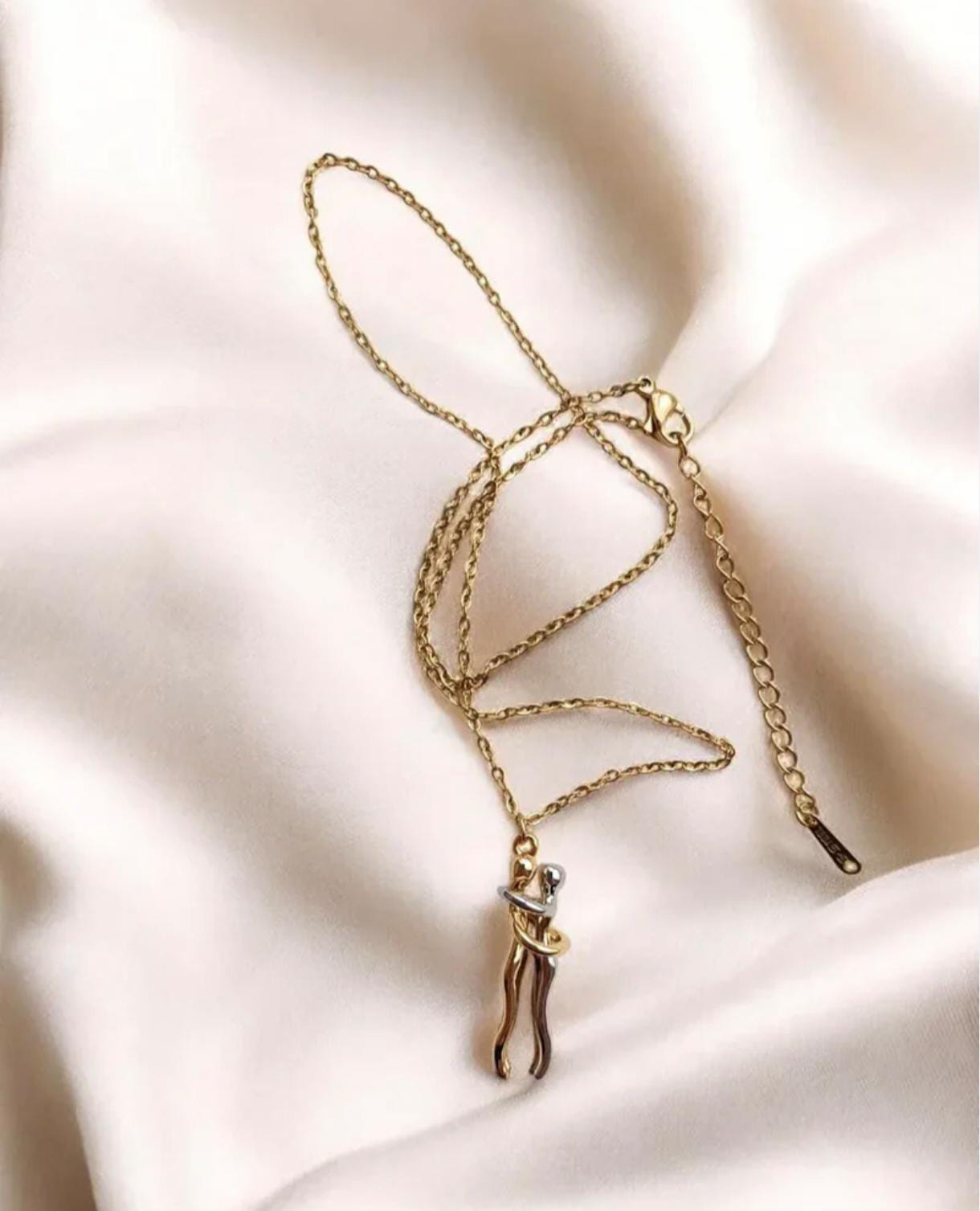 Couple Sevgili Çelik Kolye - 45 cm Sevginizi zarif bir dokunuşla ifade edin! Gold ve gümüş tonlarının birleşimiyle tasarlanan bu özel kolye, birbirine sarılan çift figürüyle aşkın ve bağlılığın simgesi.