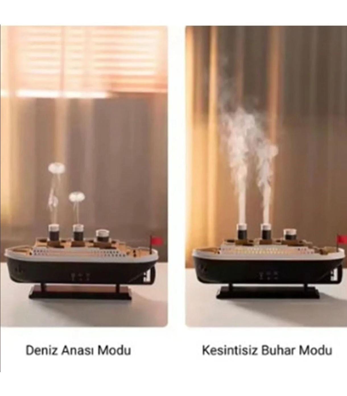 Titanic Gemi Hava Nemlendirici Işıklı Fonksiyonlu Buhar Makinesi Kumandalı Hem dekoratif tasarımı hem de fonksiyonel özellikleriyle ev veya ofis ortamınıza ferahlık katıyor